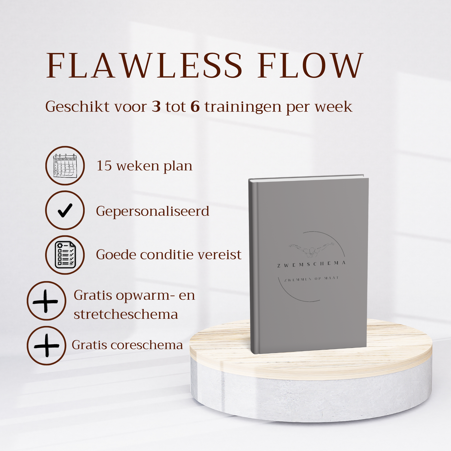 Flawless Flow: het 15 wekenplan voor zwemmers met een goede conditie, met 3–6 trainingen per week en compleet met persoonlijk schema, warming-up, stretcheschema, coreschema en exclusieve wedstrijdtips om jouw prestaties naar een hoger niveau te tillen!